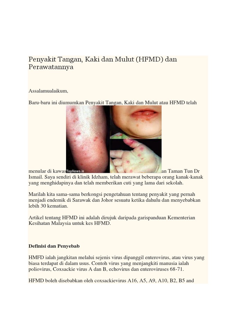 Penyakit Tangan, Kaki Dan Mulut (Hfmd) / Simptom dan tanda tanda penyakit kaki, tangan dan mulut.. Mencegah adalah lebih baik daripada mengobati. Hfmd biasanya bermula dengan demam, rasa tidak sihat yang disusuli dengan kurang selera makan. Punca utamanya ialah persekitaran yang kotor. Infeksi yang disebabkan oleh hfmd biasanya ringan, tetapi gejala lebih berat dapat terjadi pada beberapa orang. Umum menyebut hfmd, namun adakah anda tahu apakah itu hfmd.